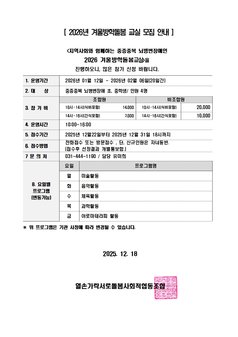 2026년 겨울방학돌봄 교실 참가 신청 안내